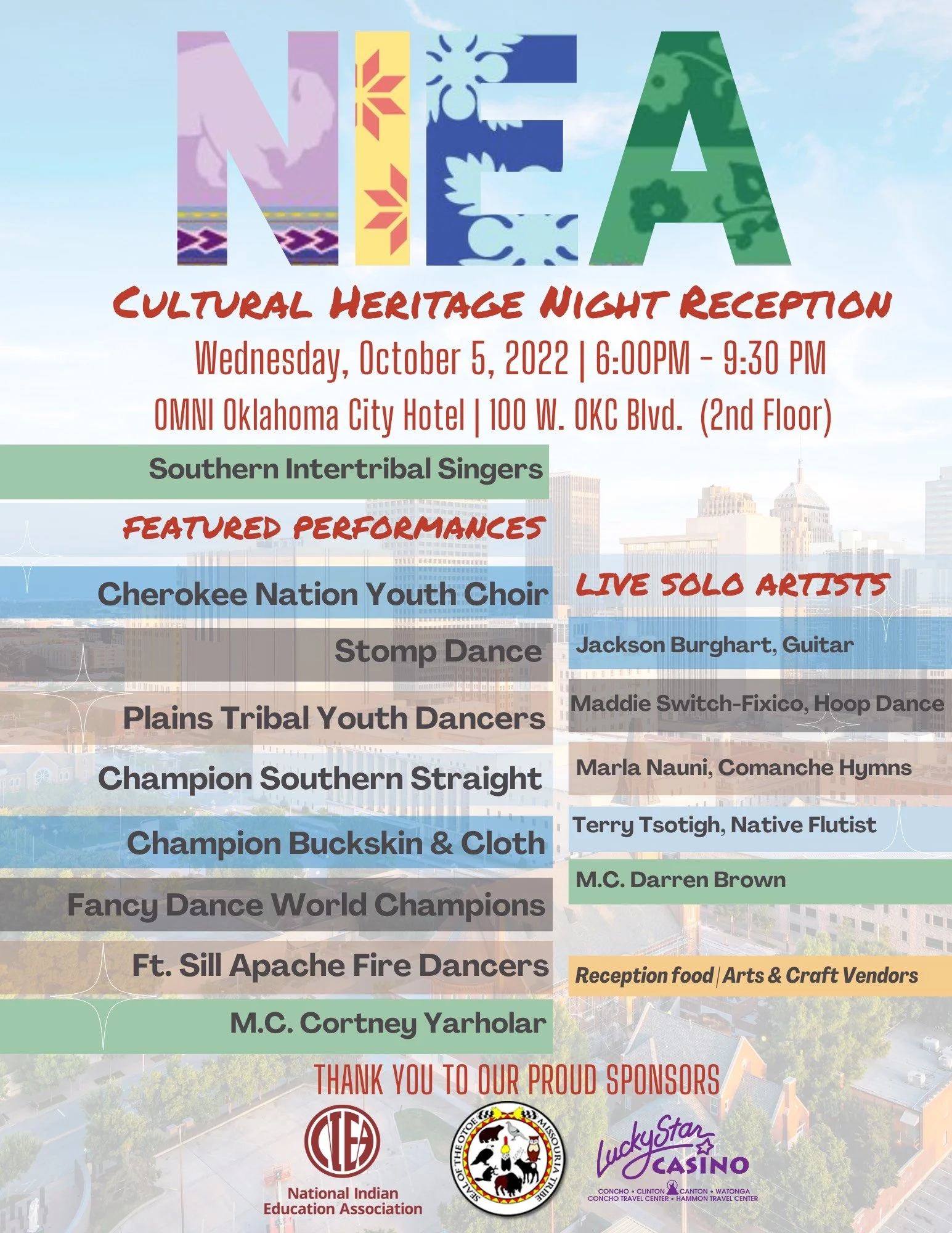 The National Indian Education Association will be holding its 53rd Annual Convention and Trade Show in Oklahoma City, OK, October 5-8th, 2022. This year our theme is Education Sovereignty. Our Choice. We are in a new era of Native education empowered through tribal sovereignty, self-governance, and the actualization of the impact of our Indigenous knowledge learning models focused on sharing and observing through compassion, generosity, and wisdom. This practice is the right to choose how our students learn. This is Education Sovereignty. Our Culture, Our Curriculum, Our Schools, Our Students, Our Choice. We are honored to continue the commitment NIEA has made for the past 52 years. This convening brings together partners, stakeholders, tribal leaders, educators, teachers, parents, and community members to impact the future of Native education.